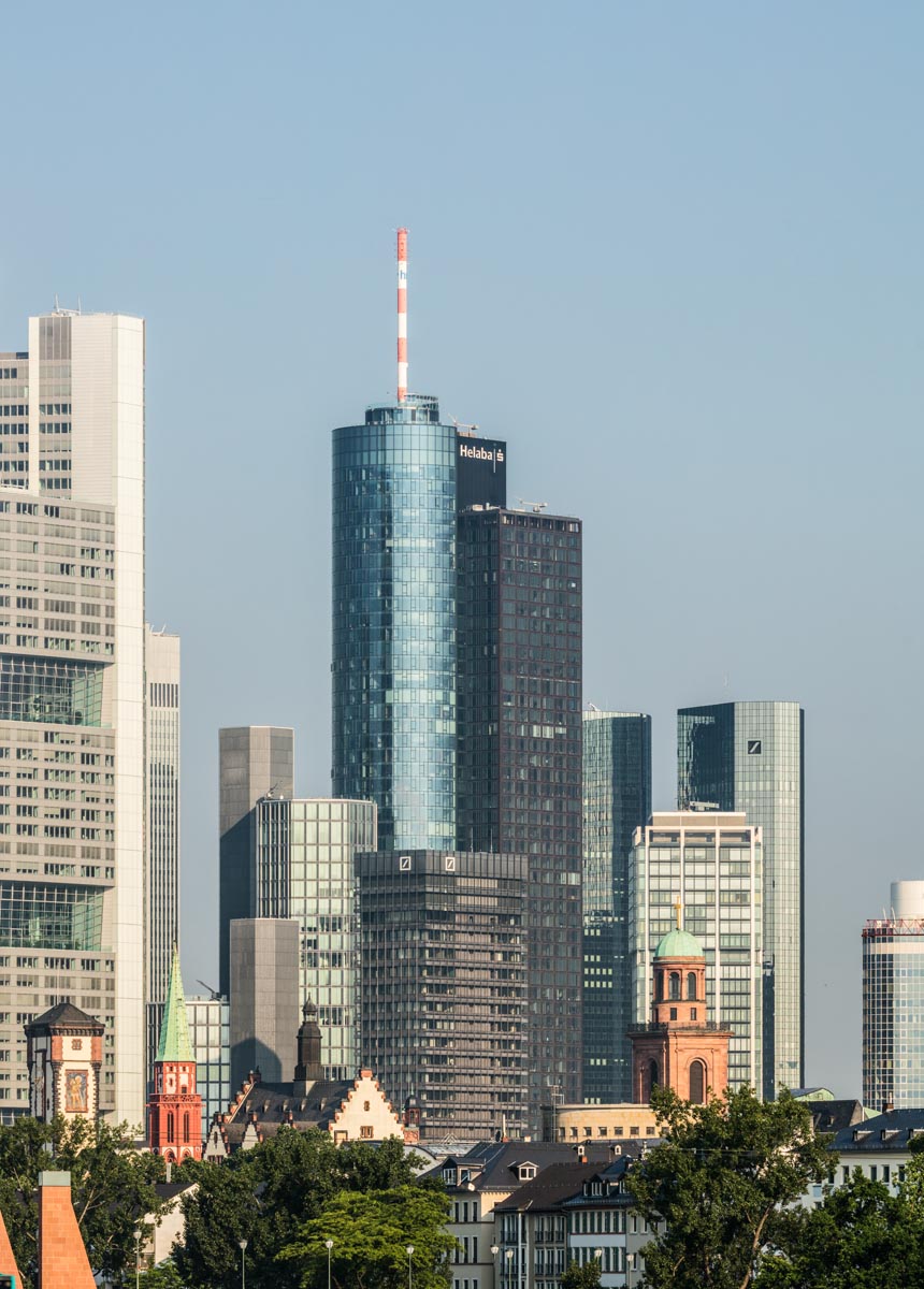 Mit seinen 200 Metern ist der MAIN TOWER das viertgrößte Hochhaus in Frankfurt am Main. Commerzbank (258m), Messeturm (256m), DG Bank (208m).